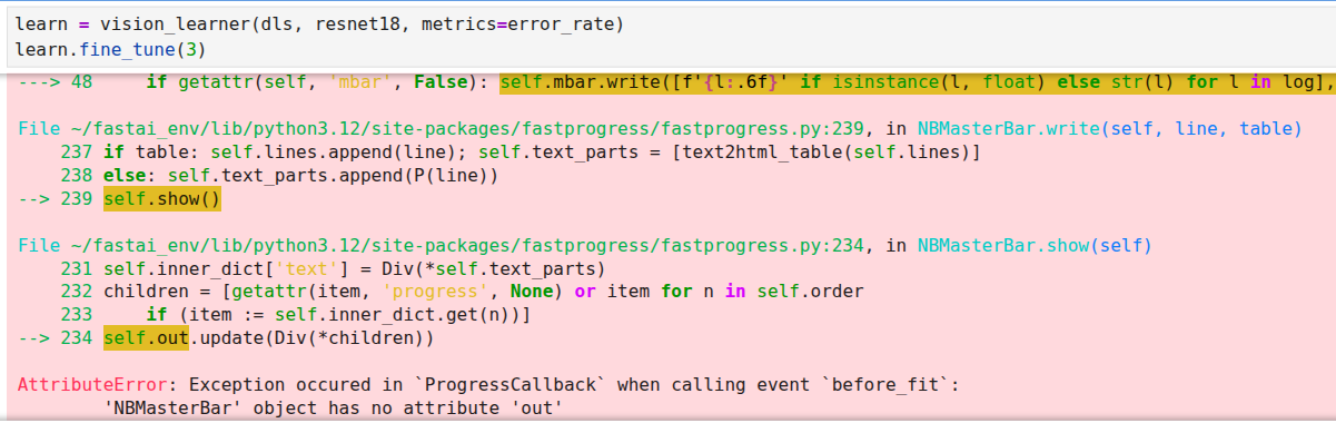 Running it in a terminal, using an older version of fastprogress (as already mentioned) or applying a patch like that in fix: 'NBMasterBar' object has no attribute 'out' by spkane · Pull Request #122 · AnswerDotAI/fastprogress · GitHub should fix this issue.