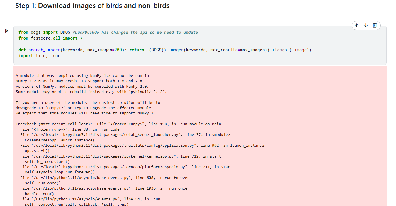 (Side note: I used the tips here to use the modified code for duckduckgo after spending a couple of hours trying to get Azure image search to work – Lesson 2: Question on How to Get a Bing Image Search API key - #5 by murilogustineli. The end of chapter 2 suggested helping folks one step behind you, so hopefully this helps).