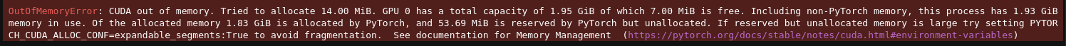 OutOfMemoryError: CUDA out of memory. Tried to allocate 14.00 MiB. GPU 0 has a total capacity of 1.95 GiB of which 7.00 MiB is free. Including non-PyTorch memory, this process has 1.93 GiB memory in use. Of the allocated memory 1.83 GiB is allocated by PyTorch, and 53.69 MiB is reserved by PyTorch but unallocated. If reserved but unallocated memory is large try setting PYTORCH_CUDA_ALLOC_CONF=expandable_segments:True to avoid fragmentation. See documentation for Memory Management (https://pytorch.org/docs/stable/notes/cuda.html#environment-variables)
